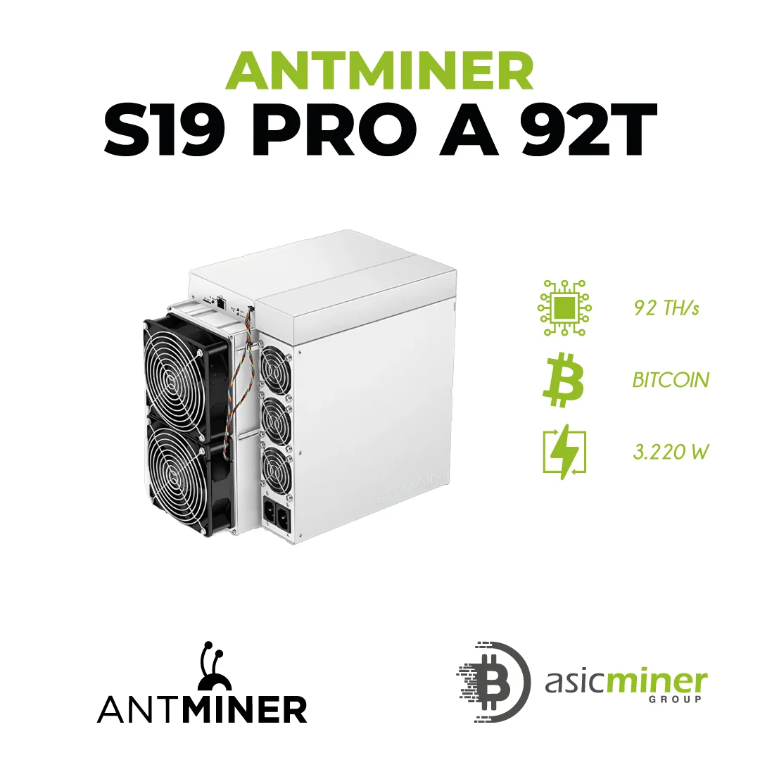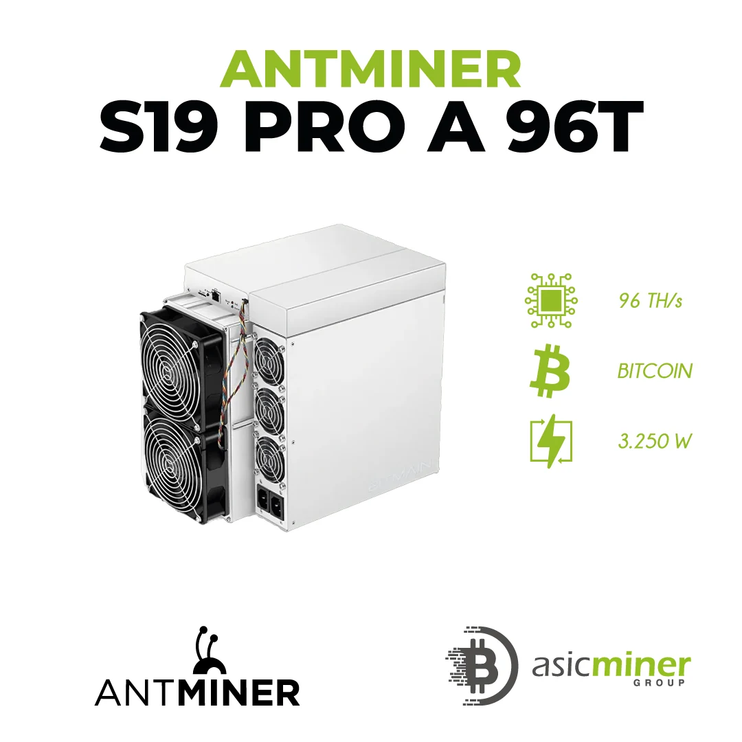 Antminer S19 PRO A 92–96T: SHA‑256 Bitcoin ASIC miner with 92–96 TH/s, industrial design, and optimized efficiency. Ideal for farms and operators looking for stability, performance, and easy scaling.