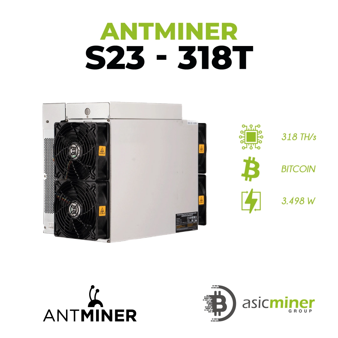 The Antminer S23 318T is a professional ASIC miner designed for Bitcoin and other SHA‑256-based mining operations that demand high hashrate, efficiency, and reliability. With a throughput of 318 TH/s, the S23 combines sustained power, optimized heat dissipation, and a robust design to operate 24/7 in farms and data centers. It is an ideal choice for operators looking to maximize production per rack without compromising stability or durability.