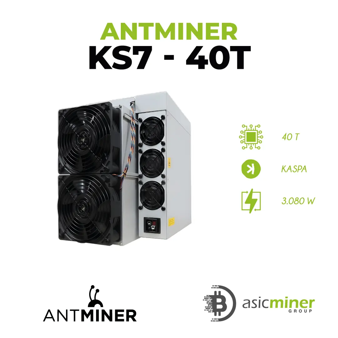 Antminer KS7: El ASIC líder para el minado de Kaspa (KAS). Ofrece un hashrate de 40 TH/s con un consumo eficiente de 3080W. Utiliza el algoritmo kHeavyHash para una máxima rentabilidad en minería de alto rendimiento.